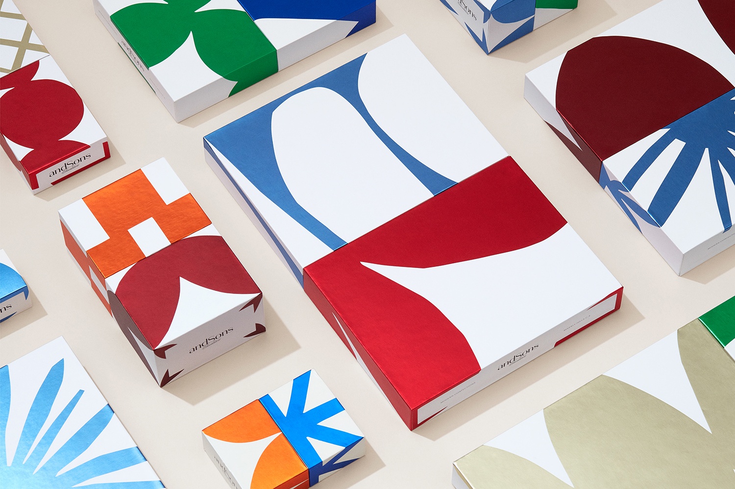 品牌標志清楚地傳達了差異,并暗示了對精美巧克力的新觀點。大膽的形式和顏色可用于表達意想不到的風味組合,在這種組合中,巧克力的形狀與任何其他巧克力一樣。在AndSons零售空間的背景下,包裝可能會很好地用作現成的預包裝禮品,并作為將選定的各個巧克力放在柜臺上的容器。彩色塊狀金屬箔  將其從熟悉的金色中移開,同時保留了某種獨特的奢華感,喚起了加利福尼亞的溫暖,并運用了現代奢華的視覺語言。